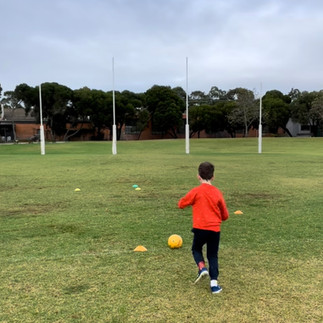 top left: running up to practice kicking a soccer ball on an open grassy field
